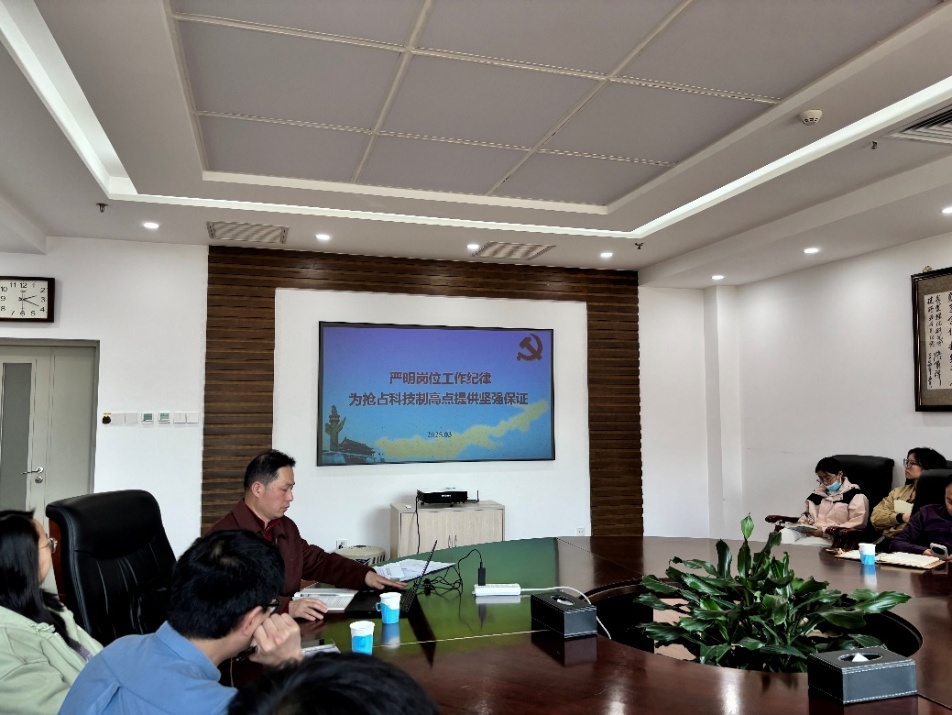 会议最后,结合“严明岗位工作纪律 为抢占科技制高点提供坚强保证”这一鲜明主题,进行了党纪教育专题学习。郑苏江讲授了专题党课,他从岗位工作记录、人员兼职管理以及科研项目申报三方面重点强调了岗位工作纪律的重要性。