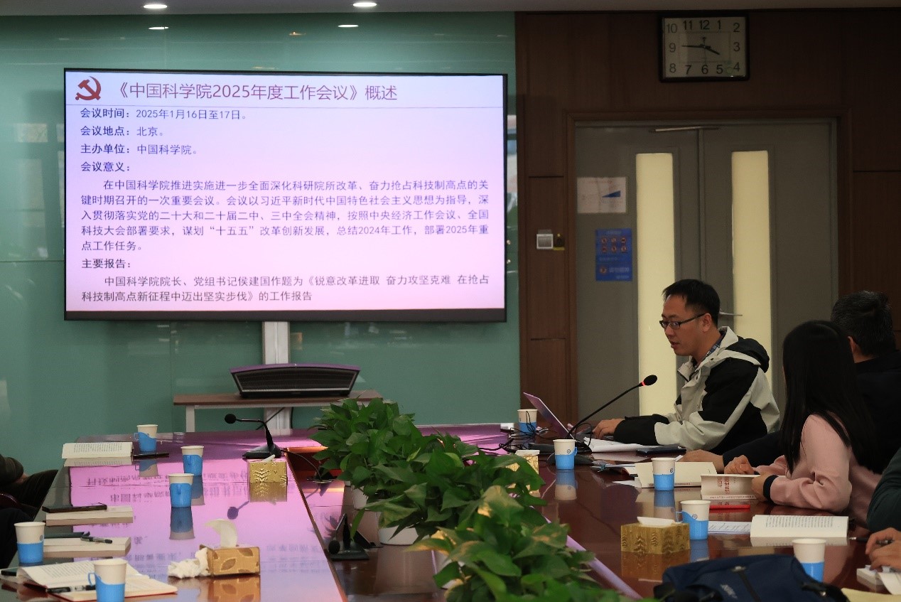 支部副书记全加传达了中国科学院2025年度工作会议精神。青年委员带领同志们围绕“艰苦奋斗”主题展开讨论,并播放视频供大家学习。会议还按程序增选了支部委员,刘成龙同志成功当选。