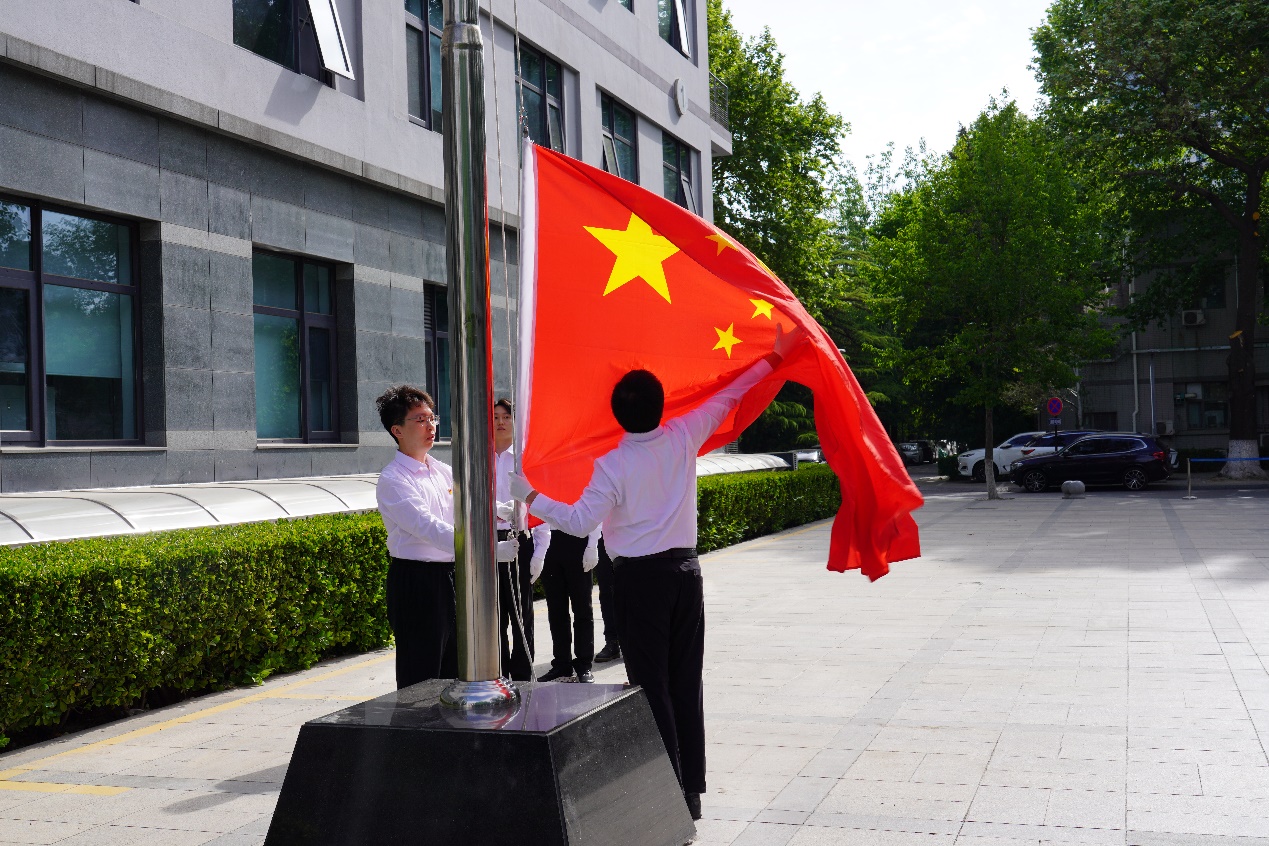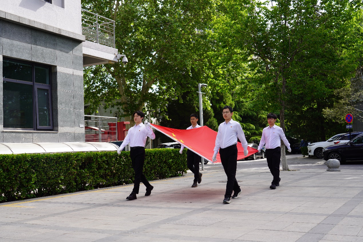 晨曦初绽,金芒破晓。护旗手刘绪博、段琦、凌浩洋和王麒麟迈着整齐的步伐,护送五星红旗入场,把国旗庄重地交到升旗手戴浩宇和李响手中。伴随着雄壮激昂的《义勇军进行曲》,在场全体人员肃立向国旗行注目礼,高唱国歌。五星红旗在理化所的上空冉冉升起。