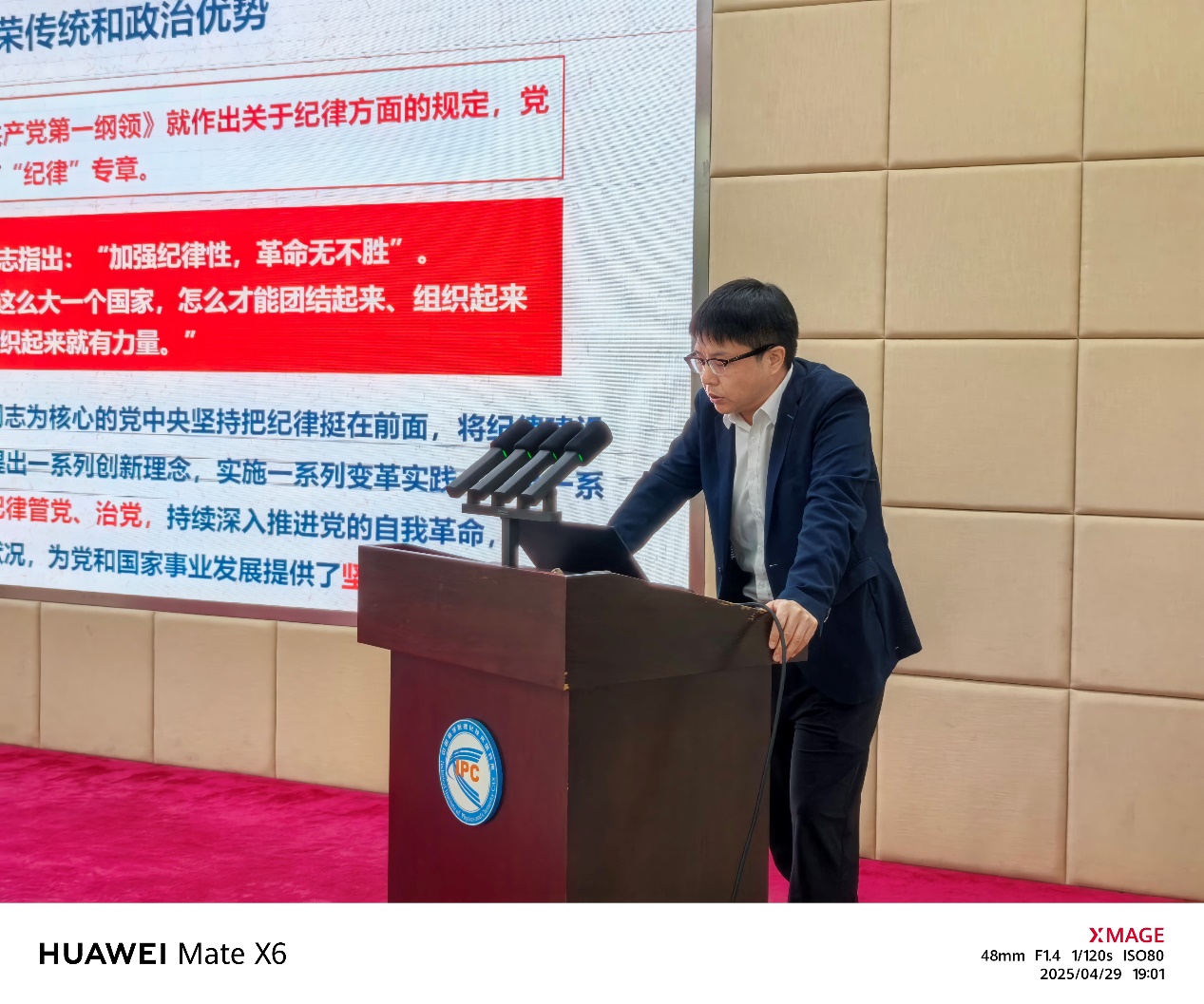 会上,张铁锐依次对纪律建设是党的光荣传统和政治优势、纪律建设是履行职责使命的必然要求、“三项制度”保障抢占科技制高点等三个版块进行了详细解读,并为党员同志介绍了纪律建设的由来、重要性以及新时代如何开展组织的纪律建设等内容。其中,着重学习了作为科学院人的职责使命,指出作为中国科学院的学生或职工,要始终以国家战略科技力量使命为导向,严守科研伦理和学术规范,将纪律意识融入科技创新全过程,要以铁的纪律锻造敢打硬仗、能担重任的科技先锋队伍,确保在抢占关键领域科技制高点的征程中行稳致远。