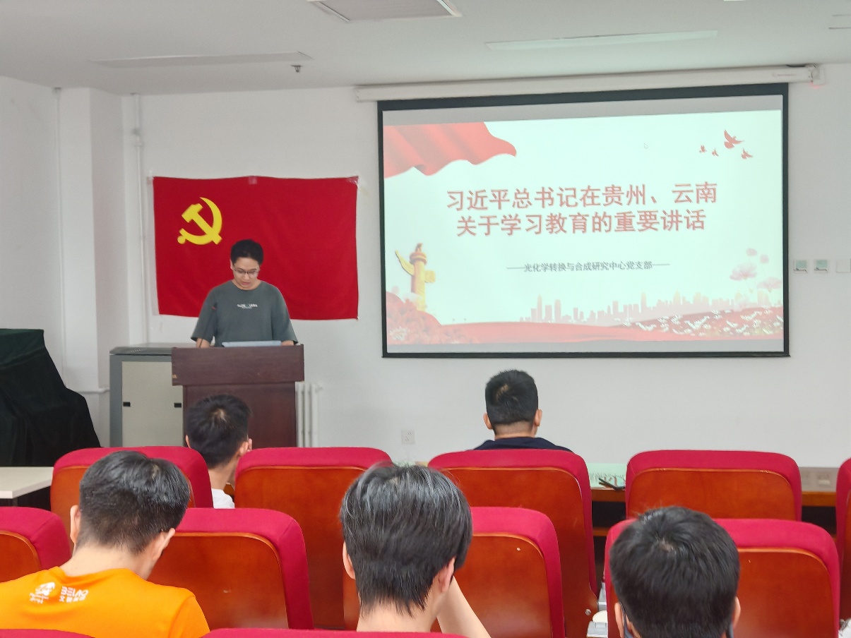 6月26日,光化学转换与合成党支部召开党员大会,学习习近平总书记在贵州、云南关于深入贯彻中央八项规定精神学习教育的重要讲话精神,并开展学习贯彻习近平新时代中国特色社会主义思想专题培训党员联学班。