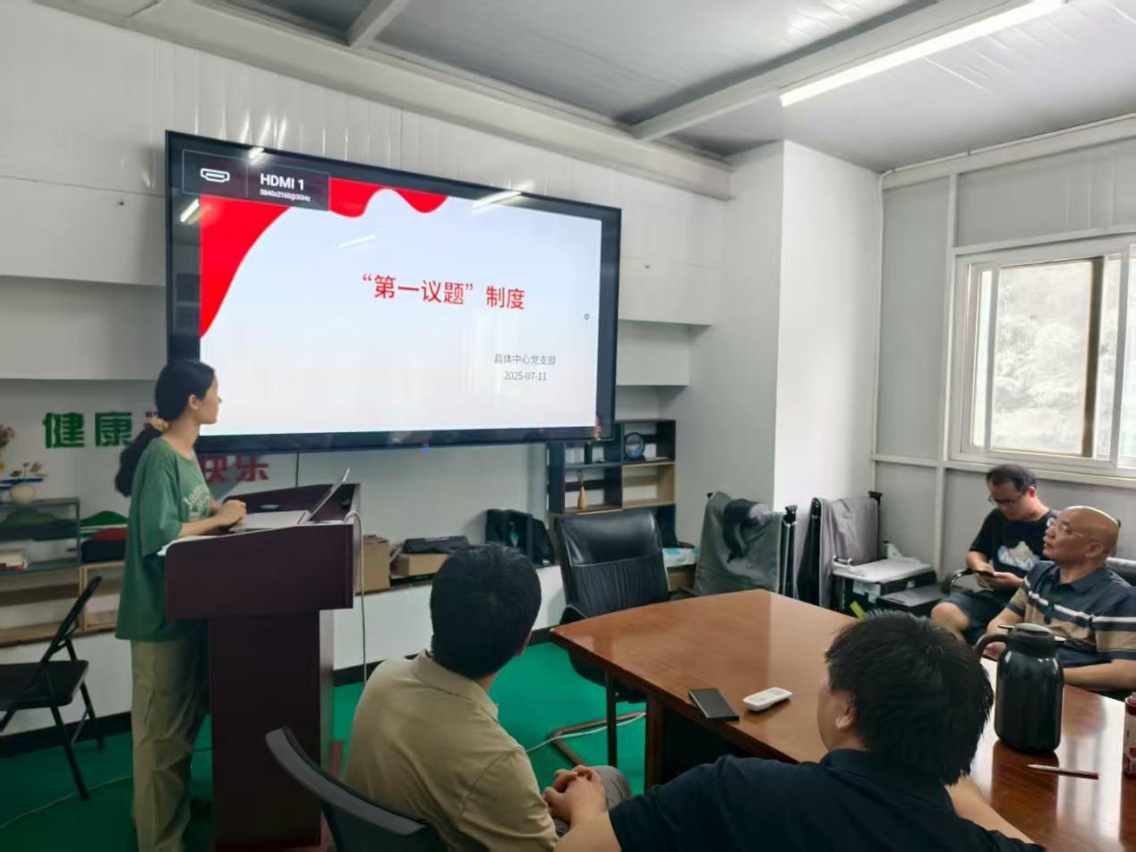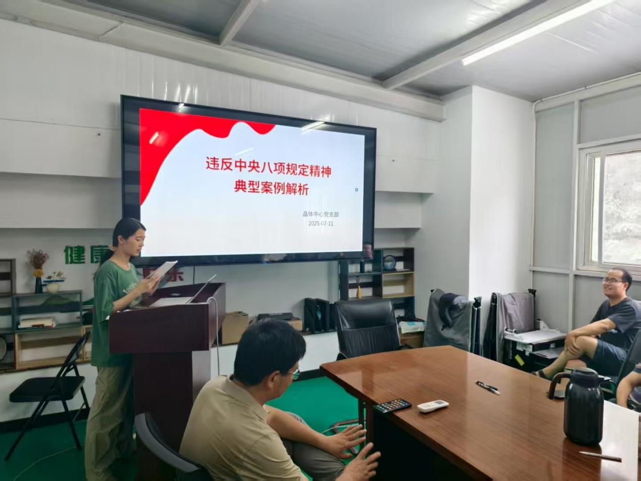 7月11日,晶体中心党支部召开支部党员大会,组织学习“第一议题”制度、《违反中央八项规定精神典型案例解析》和《党政机关厉行节约反对浪费条例》,并进行了整治违规吃喝的专题学习和警示教育。会议由支部组织委员公丕富主持。