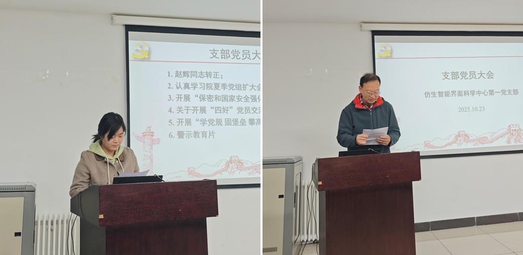 10月23日,仿生智能界面科学中心第一党支部召开支部大会并开展了系列活动。此次会议由支部书记郑美玲主持,党委书记王树涛以普通党员身份参加会议,支部组织委员万茜子同志组织预备党员转正工作,郑美玲和副书记田野、宣传委员张飞龙分别领学专题活动。40余位党员同志参加了此次会议。