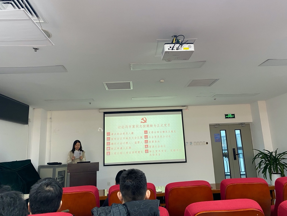 会议讨论了王宏远同志、冯宇宸同志转为正式党员的事项。按照组织发展程序,王宏远、冯宇宸分别汇报了一年来的思想和工作情况。入党介绍人介绍了对王宏远、冯宇宸同志的培养考察情况,并表示同意转为正式党员。经支部党员的充分讨论和投票表决,一致同意接收王宏远同志、冯宇宸同志为中国共产党正式党员。