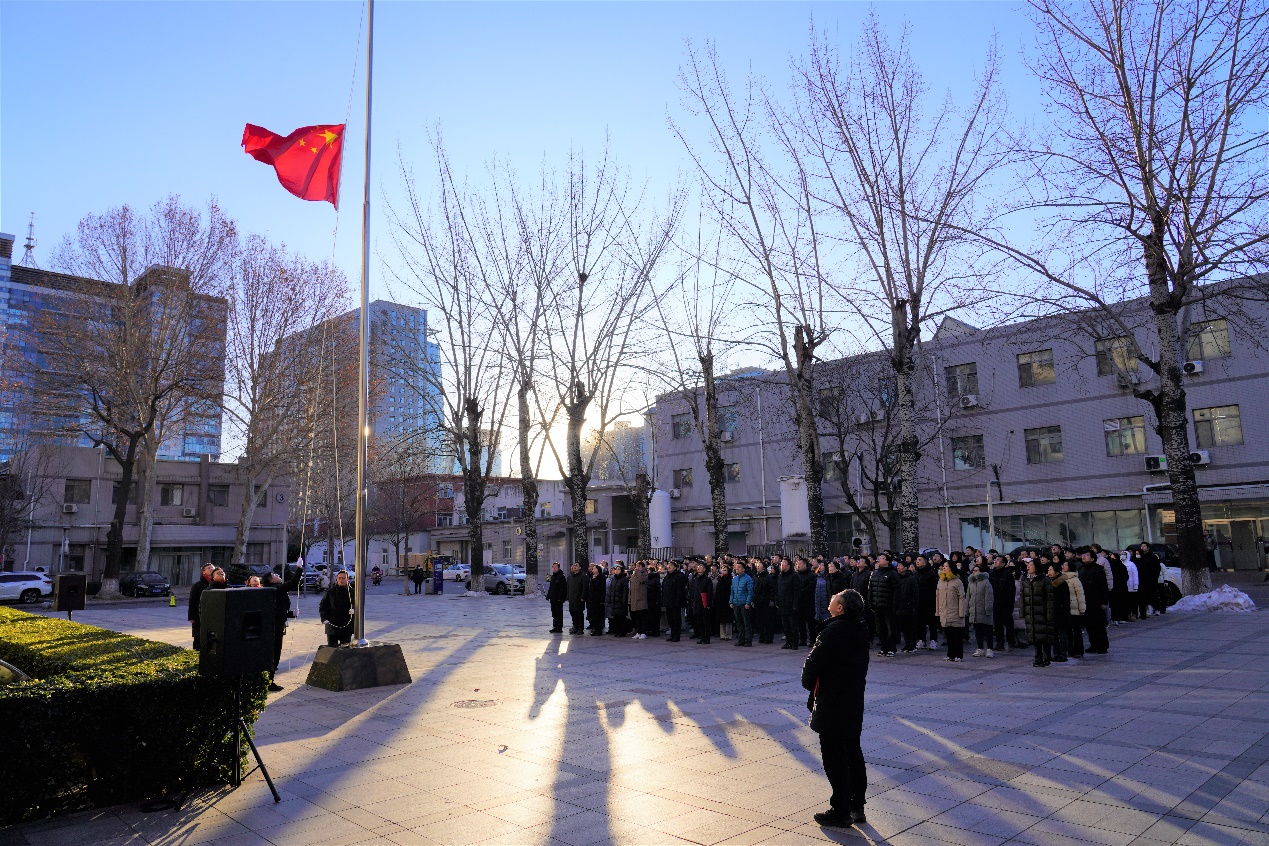 上午8时30分,升国旗仪式正式开始。在冬日朝阳中,护旗手许冠男、李晨龙、杨曦、臧如画迈着整齐的步伐护送五星红旗入场,并将国旗庄重地交到升旗手侯广磊和姚畅手中。伴随着《义勇军进行曲》激昂的旋律,全体人员肃立注目、高唱国歌,表达对祖国的热爱与对新年的美好祝愿。五星红旗冉冉升起,飘扬在广场上空。