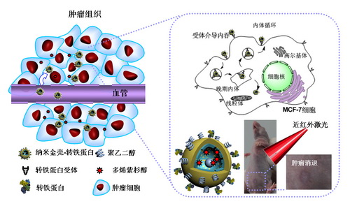 纳米金壳偶联转铁蛋白分子携带药物靶向至肿瘤,光热疗与化疗结合杀死肿瘤细胞