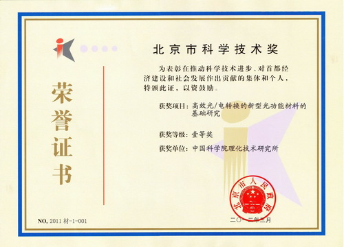 4月13日上午,北京市科学技术奖励大会暨2012年北京市科技工作会议在京召开。理化所张晓宏研究组的研究项目“高效光/电转换的新型光功能材料的基础研究”荣获2011年度北京市科学技术一等奖。