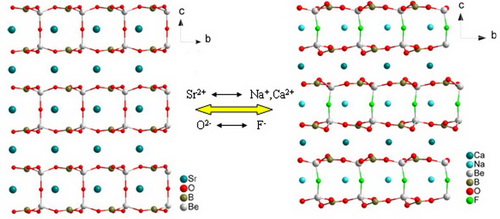 由于KBBF(KBe2BO3F2)在深紫外区拥有最优秀的非线性光学性能,而不同种类和数量的金属阳离子会影响阴离子基团构型及空间排列,中科院理化所人工晶体研究发展中心陈创天研究员领导的课题组将碱金属和碱土金属复合阳离子引入到氟硼铍酸盐中,从而获得了一种新型的氟硼铍酸盐NaSr3Be3B3O9F4,并在其结构中发现了一种新型的阴离子基团[Be3B3O12F]10-,由于其具有较大的共轭结构且在空间整齐排列而表现出大的微观非线性效应(4倍KDP),是非线性光学材料结构设计中一个优秀的结构设计单元。紫外透过光谱测试结果表明其具有较短的紫外截止边长,约为170nm,因此很可能在深紫外或紫外区域有实际应用价值。研究成果以通讯的形式发表在德国应用化学杂志上(Angew. Chem. Int. Ed. 2011, 50, 9141–9144)。同时,在通过阴阳离子双重替代对重要的非线性光学晶体SBBO(Sr2Be2B2O7)结构进行调控时获得了一系列“类SBBO”新化合物MM′Be2B2O6F (M=Na,M′=Ca;M=K,M′=Ca,Sr),在MM′Be2B2O6F系列中不仅消除了SBBO中的存在的结构多型性问题,也表现出了良好的生长习性,其中NaCaBe2B2O6F具有较好的非线性光学性能和深紫外截止边。研究成果以全文的形式发表在材料化学杂志上(Chem. Mater. 2011, 23, 5457?5463)。复合阳离子氟硼铍酸盐体系的研究工作为新型深紫外非线性光学晶体材料的研究开辟了一个新的探索方向。