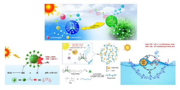 为了探索利用太阳能高效催化制氢的新途径,中国科学院理化技术研究所超分子光化学课题组深入开展了多个模拟氢化酶功能体系构建和催化机理的研究。在温和的条件下,高效、高产率地合成了一系列结构多样的新型氢化酶模拟化合物;构筑了第一个人工模拟铁氢化酶光致产氢的分子催化剂;利用自组装将光敏剂与铁氢化酶模拟化合物引入水相,模拟还原了自然界氢化酶的产氢环境;在国际上率先突破了铁氢化酶模拟化合物稳定性差、催化效率低的瓶颈,实现了太阳光驱动铁氢化酶模拟化合物的水相高效产氢,构筑了高效、稳定、廉价的模拟酶光催化产氢新体系,获得了目前铁氢化酶模拟化合物光催化体系的最高产氢效率,从分子水平上揭示了模拟铁氢化酶体系的光催化产氢机理。例如:通过界面组装的方法将铁氢化酶模拟化合物组装到水溶性CdSe量子点的表面,成功制备的水溶性模拟铁氢化酶光催化剂在光照80小时产生氢气的催化转化数(TON)和催化速率(TOF)高达8781和596h-1;通过共价键的方式将铁氢化酶模拟化合物挂接在水溶性高分子(PAA)骨架上,以CdSe量子点和PAA聚合物催化剂构筑的光催化体系光照8小时TON达到27135,初始产氢速率TOF达3.6s-1,是目前铁氢化酶模拟化合物光催化产氢的最高效率;通过分子自组装将铁氢化酶模拟化合物和CdTe量子点包裹在壳聚糖中,模拟铁氢化酶催化活性中心所处的蛋白环境对催化产氢行为的影响,研究发现壳聚糖光催化产氢体系的稳定性显著提高,与相同条件没有壳聚糖存在的体系相比,催化产氢活性提高了4000多倍,TON高达52800。这些研究结果对于发展太阳能光催化制氢体系意义重大。相关研究成果发表在国际一流期刊《能源环境与科学》(Energy & Environmental Science)、《德国应用化学》(Angewandte Chemie International Edition)和《自然通讯》(Nature Communications)上,并被选为Energy & Environmental Science第九期内封面文章向读者重点推荐。