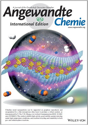 相关研究结果以“热点文章(hotpaper)”形式发表在国际化学领域顶级期刊德国应用化学(Angewandte Chemie International Edition),并被选为当期“内封面(inside cover)”向读者重点推荐。随后国际著名科学媒体Materials Views以“A robust graphene-supported catalyst”为题对该研究进行了亮点点评(highlight)。该报道认为,这种石墨烯模板和“介孔二氧化硅封装保护”策略的组合提供了一个健壮的开发高稳定工业相关催化剂的平台。