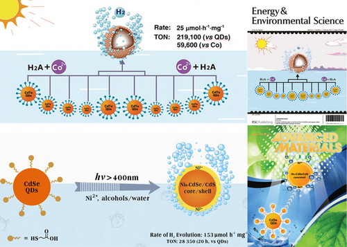 中科院理化所超分子光化学研究团队长期致力于光化学转化的研究。近期,团队成员利用量子点这一新兴“人工原子”设计合成了新颖结构和组成的人工光合成催化剂,建立了通过量子点和廉价金属原位制备人工光合成催化剂的方法,获得了高效、稳定、廉价的人工光合成催化剂,取得了可见光催化制氢研究的突破性进展。例如:利用可见光照射MPA-CdTe量子点和无机钴盐成功制备了具有空腔结构的人工光合成催化剂Coh-CdTe。在抗坏血酸存在下光照70小时,Coh-CdTe的产氢速率为25μmolh-1mg-1,产氢效率TON高达219100(基于量子点摩尔浓度)或59600(基于催化剂的Co浓度);利用可见光照射MPA-CdSe量子点和无机镍盐的异丙醇水溶液原位制备了Nih-CdSe/CdS核壳结构的人工光合成催化剂。可见光照射10小时,Nih-CdSe/CdS的产氢速率达153μmolh-1mg-1,产氢效率TON达15340(基于CdSe量子点摩尔浓度)或18000(基于催化剂的Ni浓度),可见光410nm光催化产氢的内量子效率为11.2%。通过XRD、XPS、ICP-AES表征揭示了光照后生成的Nih-CdSe/CdS核壳结构人工光合成催化剂,稳态和时间分辨光谱证明CdSe量子点受光激发后发生了向镍离子的光诱导电子转移,ESR及光谱实验证实在光照过程中产生了羟基自由基和丙酮,说明水参与了整个催化循环。相关研究结果发表在国际一流期刊《能源环境科学》(Energy Environ. Sci. 2013, 6(2), 465-469)及《先进材料》(Adv. Mater. 2013, 25(45), 6613-6618)上,并作为封面和封底文章重点向读者推荐。