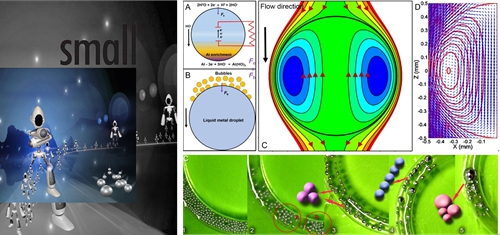 在《Small》上在线发表的题为“基于自驱动液态金属马达群碰撞与融合行为的过渡态机器”(Transient state machine enabled from the colliding and coalescence of a swarm of autonomously running liquid metal motors, DOI: 10.1002/small.201501364, 2015)论文中,研究小组首次定义并证实了一种崭新的机器形态——过渡态机器,论文被选为期刊内封面故事。