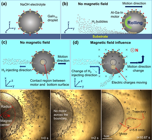 图2 磁场作用下铝质驱动液态金属马达的运动机制与磁陷阱效应