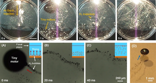 图4 铝质驱动液态金属马达产生的氢气流轨迹与驱动颗粒运动情形