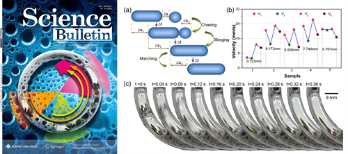 此外,在期刊《Science Bulletin》发表的系列研究(60: 1203, 2015;60: 943, 2015, 封面文章;60: 648, 2015)中,研究人员还先后揭示出了液态金属马达的自驱动宏观布朗运动现象及其固-液界面接触产氢机制(图4),以及在轨运行液态金属车辆间的协同运动与无缝连接行为(图5),包括金属液滴接触融合过程中的动态变形弹簧与弹射现象等(图6),揭开了其中的控制因素如表面张力波、电双层效应等。