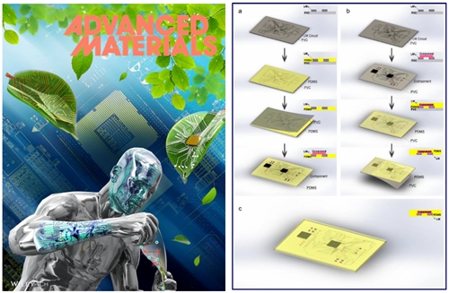 图1 《先进材料》背封面及用以制造适形化柔性功能电子的液态金属相变转印原理