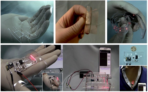图2 利用转印方法打印并集成的柔性可编程腕带及采用手机操控的微型无线红外测温仪