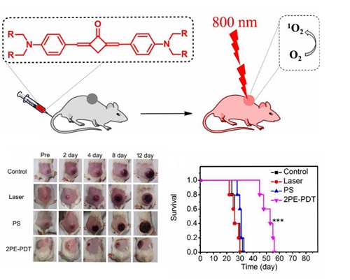 在国家自然科学基金的资助下,理化所多年来一直坚持开展双光子光动力治疗药物的基础研究。近日,中科院理化所吴飞鹏研究员和赵榆霞研究员与解放军总医院激光科顾瑛教授合作,通过化学手段修饰亚苄基环烷烃酮分子,研制出了在生物光学窗口既具有高效双光子吸收又满足临床静脉给药要求的小分子光敏剂。通过荷瘤小鼠实验,充分证实了双光子光动力治疗的效果,经一次光照治疗后小鼠肿瘤的生长即被明显抑制,小鼠的生存期延长了一倍。该研究为推进双光子光动力治疗技术的临床应用解决了最大的技术瓶颈问题。
