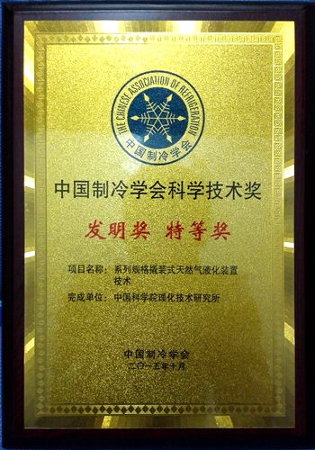 在11月17日于成都举行的“2015中国制冷学会学术年会”颁奖仪式上,由中国科学院理化技术研究所低温与制冷工程研究中心完成的“系列规格撬装式天然气液化装置技术”项目获得第七届中国制冷学会技术发明特等奖,该项目是设置技术发明奖以来目前仅有的一个特等奖。