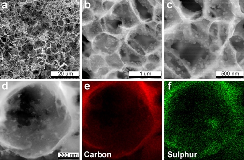 3D S@ PGC复合物形貌和元素分布:(a~c)为在不同放大倍数下的SEM图片,(d~f)为TEM图片及对应形貌中C和S的分布