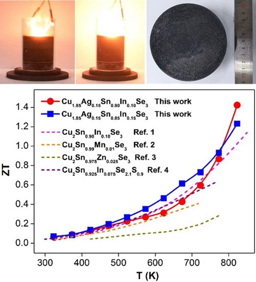 图1. 燃烧合成的Cu2SnSe3热电材料,ZT值达到1.4,是迄今报道的Cu2SnSe3的最高水平