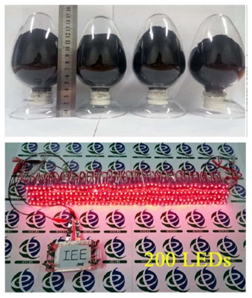 图3. 燃烧合成制备的石墨烯,以之为电极做成的超级电容器,可同时点亮200个LED灯