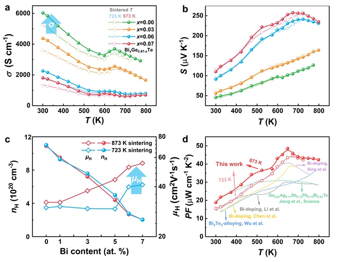 图4. 缺陷结构演化对电输运性能的影响。(a,b)电导率和Seebeck系数随温度变化的趋势图;(c)室温下Hall载流子浓度和迁移率的变化情况;(d)功率因子随温度的变化及与其他文献的对比情况。