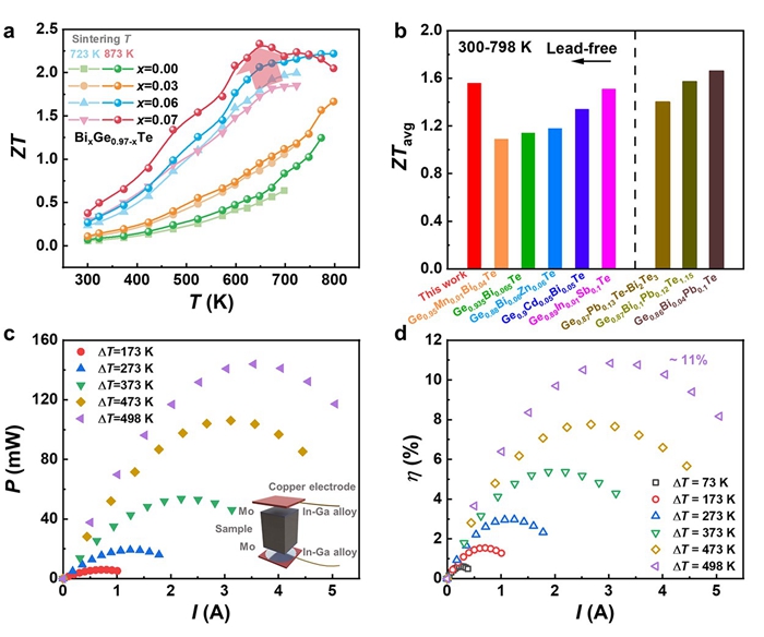图5. 热电优值与转化效率测试。(a)不同烧结温度下ZT值随温度变化情况的对比;(b) 300-798 K下平均ZT值与其他文献的对比情况;(c,d) 器件测试的输出功率及效率。