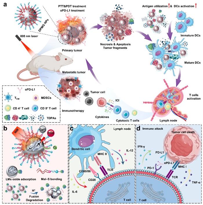 注:(a)杀伤性免疫反馈的示意图。(b)液态金属纳米材料的光热/光动力,抗原捕获和微酸环境降解等特性的示意图。(c)成熟的DCs处理和交叉呈递抗原,促进T细胞的成熟和激活。(d)激活的T细胞识别肿瘤细胞,并伴随着细胞因子的分泌和免疫检查点的阻断,从而实现免疫攻击。