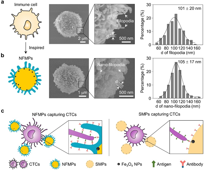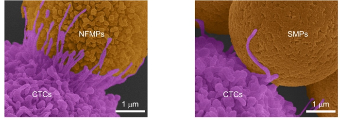 图2:NFMPs表面拓扑结构与CTCs伪足紧密结合,SMPs表面光滑难以与CTCs伪足紧密结合