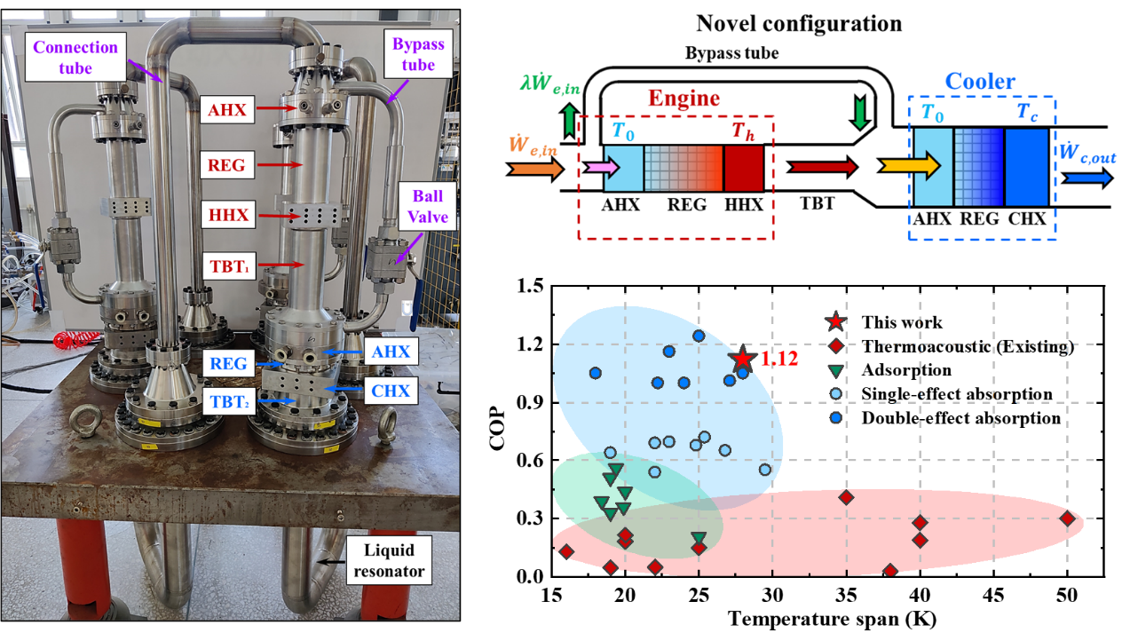图1. 新型热驱动热声制冷系统及其实验样机性能