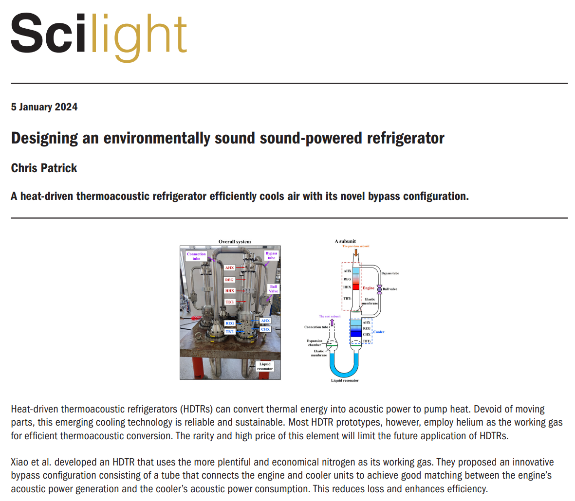 此外,相比氦气,氮气作为一种更常见、经济的工质,亦十分具有应用前景。采用氮气作为工质时,在标准空调制冷工况下该系统实验的COP仍能达到0.49,且展示出与氦气不同的工作特性。数值计算结果表明,如对系统结构尤其是回热器填料进行优化改进后,其COP还可大幅提升。相关研究以An efficient and eco-friendly heat-driven thermoacoustic refrigerator with bypass configuration为题发表在物理学期刊Applied Physics Letters上,并被编辑选为亮点论文(Featured Article),且受到美国物理学联合会《科学之光》(AIP Scilight)的专访报道。论文第一作者为理化所2021级直博生肖磊,通讯作者为理化所罗二仓研究员与吴张华高级工程师,理化所为第一兼通讯作者单位。
