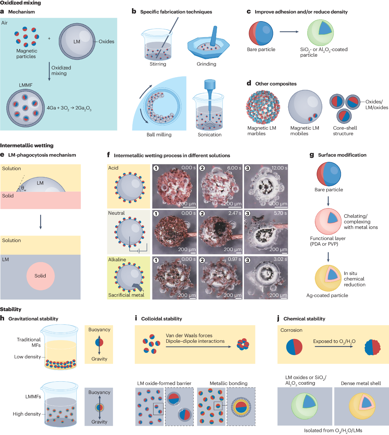 在这篇综述中,作者首先介绍了制备液态金属基磁流体的主要方法,包括氧化混合法和金属间润湿法等。氧化混合法利用搅拌、研磨、球磨和超声等技术破坏液态金属氧化层,并产生新的氧化物附着在磁性颗粒上形成涂层。由于新的氧化物涂层很容易与液态金属混溶,磁颗粒就这样与液态金属载液混合形成液态金属基磁流体。金属间润湿法利用液态金属“胞吞”现象(将能够被液态金属润湿的颗粒内吞化)制备液态金属基磁流体。对比传统磁流体,液态金属基磁流体表现出良好的重力稳定性,胶体稳定性和化学稳定性(图1)。