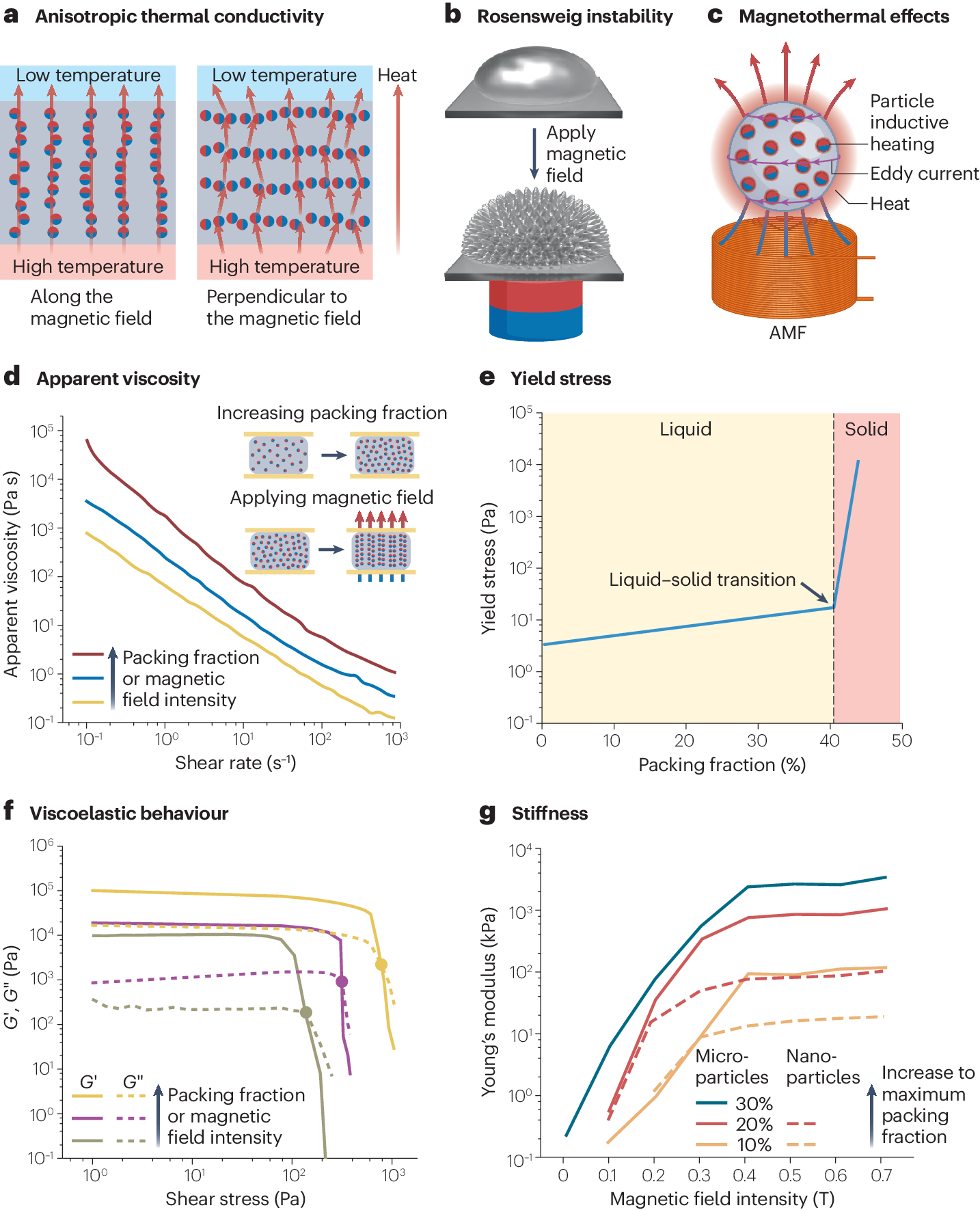 随后,文章全面总结了液态金属基磁流体的特性,并讨论了它们与传统磁流体的区别。传统载液的热导率和电导率通常较低,而液态金属载液使由此形成的磁流体具有较高的热导率和电导率。液态金属基磁流体也具有典型磁响应特性和电磁感应能力。与传统磁流体相比,液态金属基磁流体中还具有显著磁热效应。此外,液态金属基磁流体也表现出典型的磁流变行为,液态金属固体氧化物赋予液态金属基磁流体非牛顿流体特性(图2)。