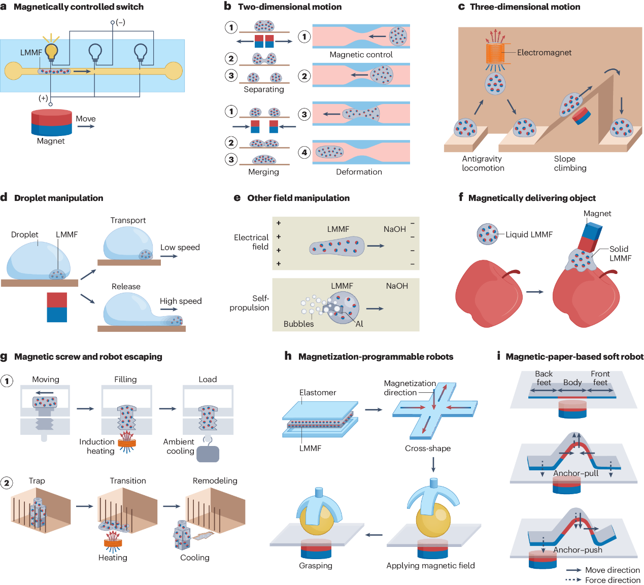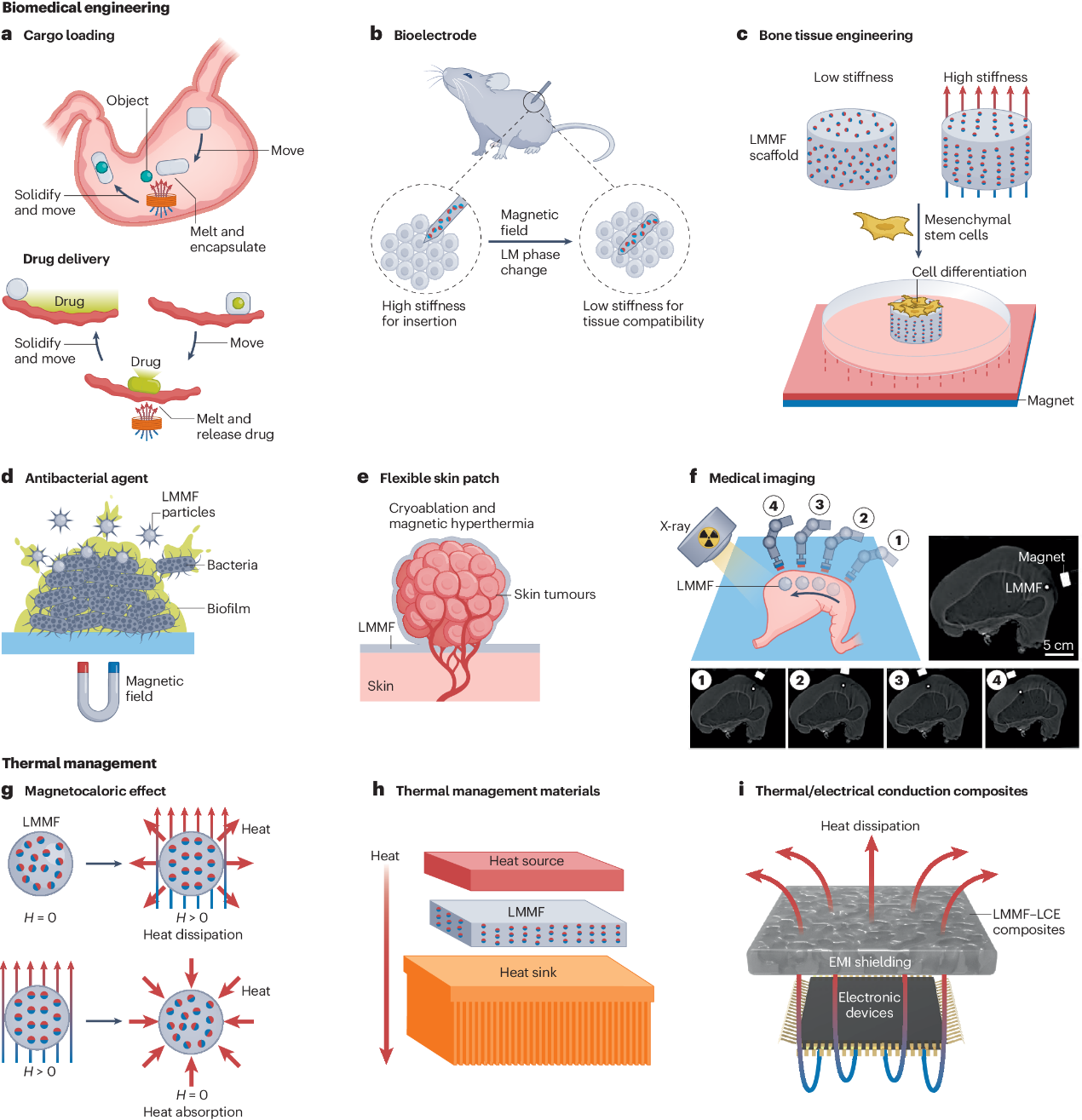 文章进一步概述了液态金属基磁流体在生物医学工程、热管理、印刷电子、柔性传感器和软体机器人领域的应用。在生医工程领域,液态金属基磁流体可被用于靶向递药、生物电极、骨组织工程支架、抗菌剂、治疗肿瘤的柔性贴片和医学成像等。在热管理领域,液态金属基磁流体被用于制造磁制冷液态金属和无泄漏的热管理材料。在印刷电子领域,液态金属基磁流体可在各种基底上创建无泄漏导电图案。在柔性传感器领域,液态金属基磁流体可对热场、电场和磁场等激励做出反应,并可适应各种界面,是柔性传感应用的理想选择。在软体机器人领域,液态金属基磁流体具有对磁场的快速响应、出色的形状适应性、可调刚度和高导电性,是制作软体机器人的基本要素(图3、4、5)。