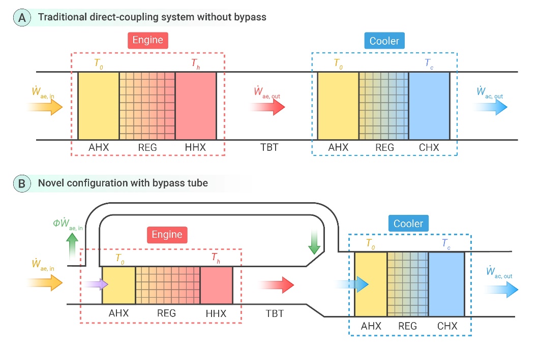图1. (A) 传统直连型热驱动热声制冷系统;(B) 新型功流旁通型热驱动热声制冷系统