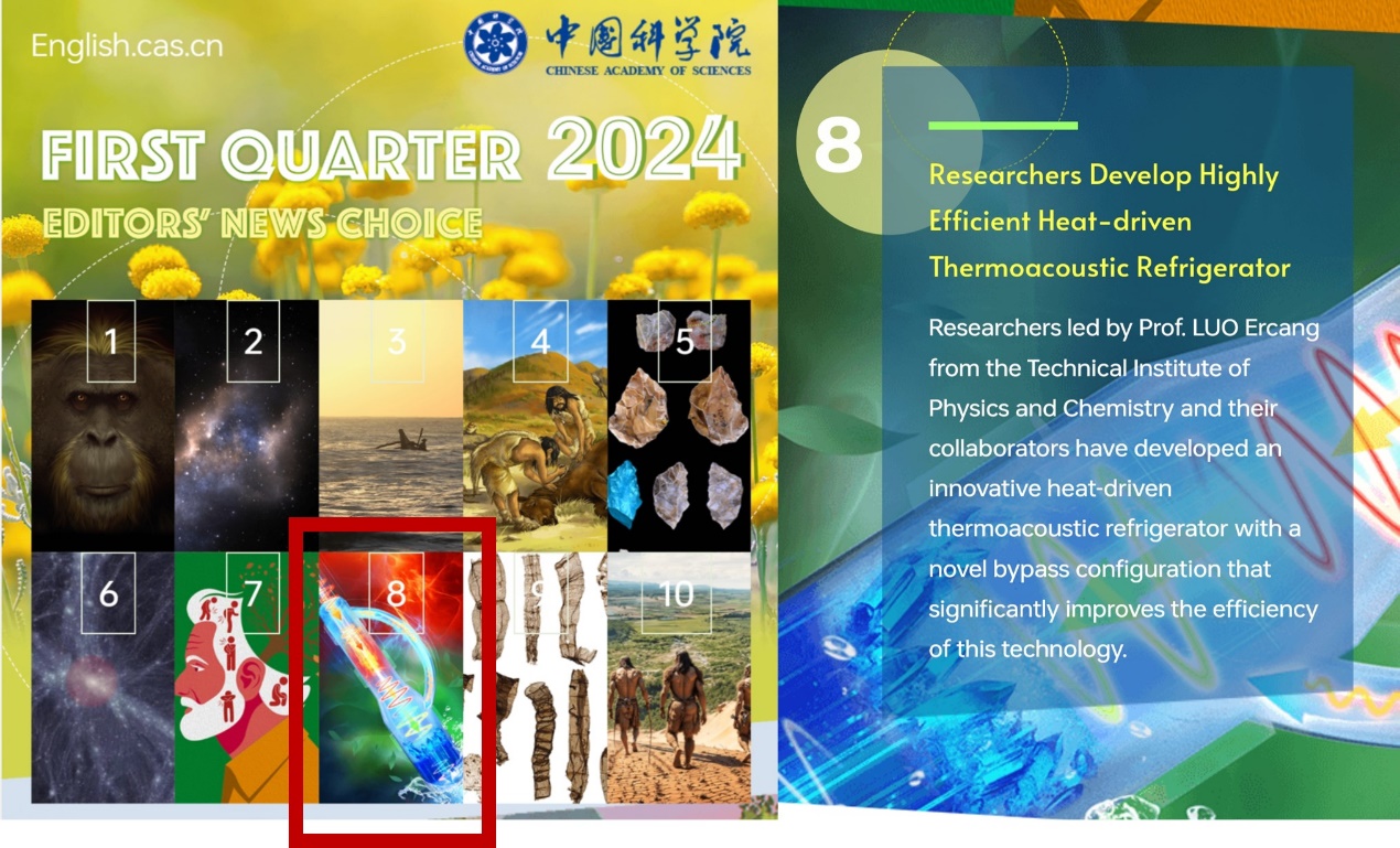 在现有的直接耦合型热驱动热声制冷系统(图1 (A))中,较合适的行波声场和较紧凑的耦合方式使得其在一定温度范围内能取得不错的制冷性能,在标准空调制冷工况(环境温度35 °C,制冷温度7 °C,下同)下其COP可超过0.4。然而其中的发动机与制冷机的功流匹配问题限制了更高加热温度下系统效率的进一步提升。近期,理化所低温制冷与特种动力技术研究中心罗二仓研究员领导的热声研究组提出了一种功流旁通型制冷流程,如图1 (B) 所示,在发动机和制冷机之间增加一个旁通结构,使得部分声功绕过发动机而直接进入制冷机,通过调节旁通的功流比例,在不同加热温度下均可实现发动机和制冷机之间的良好功流匹配,在高加热温度下使得系统的COP大幅度提升。研究组成员搭建了一台三单元行波环路型系统,并采用液体振子进一步降低系统工作频率和损失。前期的实验研究表明当加热温度为450 °C时,在标准空调制冷工况下系统获得的COP可达1.12,大幅度超过当时报道的同类型系统的最好结果。该工作成果入选2024年中国科学院英文网站第一季度亮点专题。