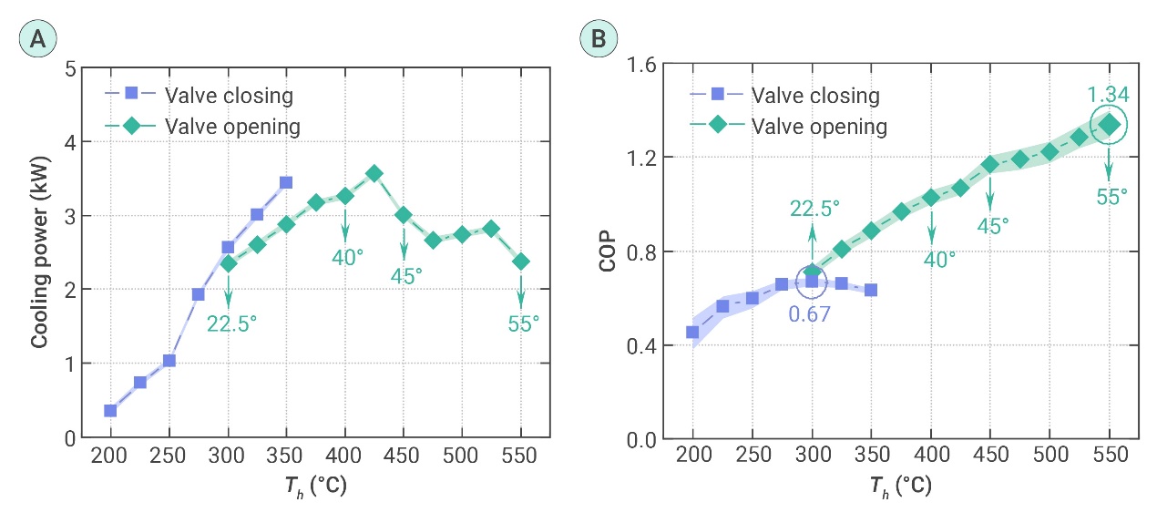 图3. (A) 制冷功率与 (B) COP 随加热温度的变化
