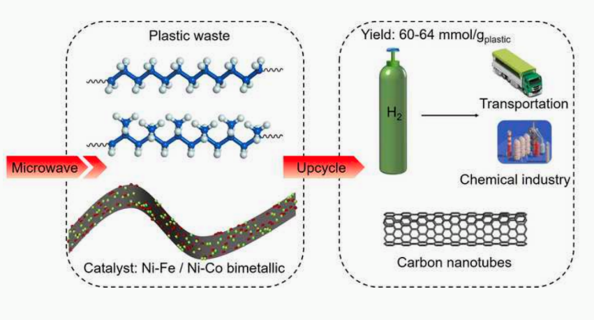 在废旧聚烯烃塑料化学回收方面,课题组通过结构设计和功能活性物种组装,采用简易的一步燃烧法制备了多种兼具微波吸收和催化性能的自分散Ni-Co和Ni-Fe双金属催化剂。在微波驱动下,约3.5分钟便可将多种废塑料如LDPE、HDPE、PP和填埋场混杂废塑料高效转化为氢气和多璧碳纳米管。同时,相比于传统电炉加热方式,微波驱动催化不仅可以提升2~3倍的氢气产量,而且能显著降低能量消耗。相关研究工作发表于Chemical Engineering Journal (2024, 483, 149270)。