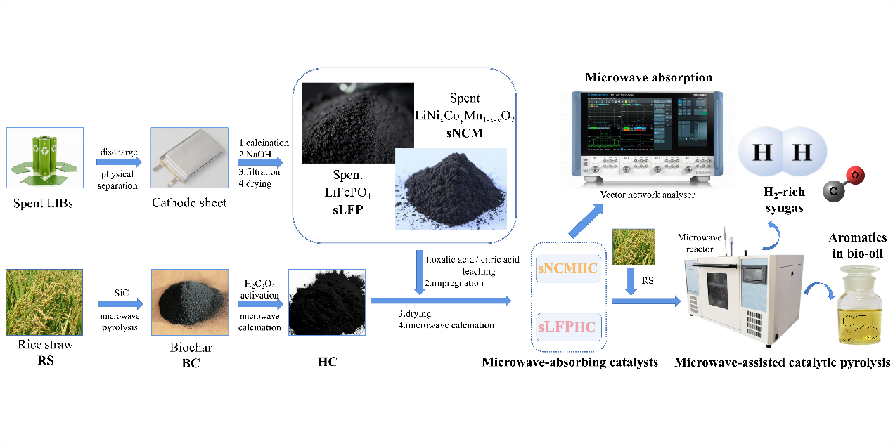 在农林废弃生物质回收方面,课题组以价廉经济的生物炭为原料,以废旧锂离子电池和生物质共回收为出发点,成功制备了多种性能优异的锂离子电池衍生催化剂。在微波驱动且较为温和的条件下(350 ºC)成功将水稻秸秆催化转化为高产量附加值合成气(H2和CO)和富含单环芳烃的液体产品。相关研究工作发表于Journal of Environmental Chemical Engineering (2024, 12, 112099)。