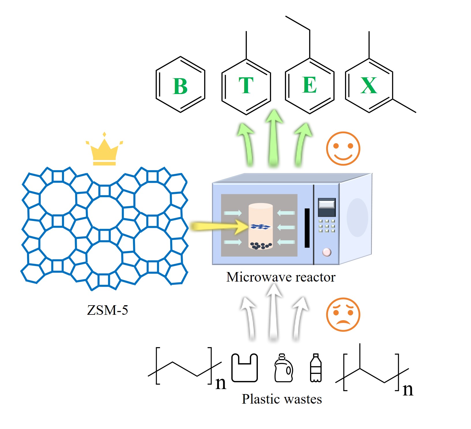 废塑料向单体和基础化工产品的转化是有效管理废塑料和实现循环经济的重要举措。近日,课题组开发了一种一步微波热解耦合ZSM-5催化重整技术,成功实现了多种塑料如LDPE、HDPE、PP和混合塑料向乙烯、丙烯、丁烯、苯、甲苯、乙苯和二甲苯的高效催化转化,为塑料向高价值石化产品的转化提供了一种潜在的途径。相关研究工作发表于Energy Conversion and Management (2024, 312, 118571)。
