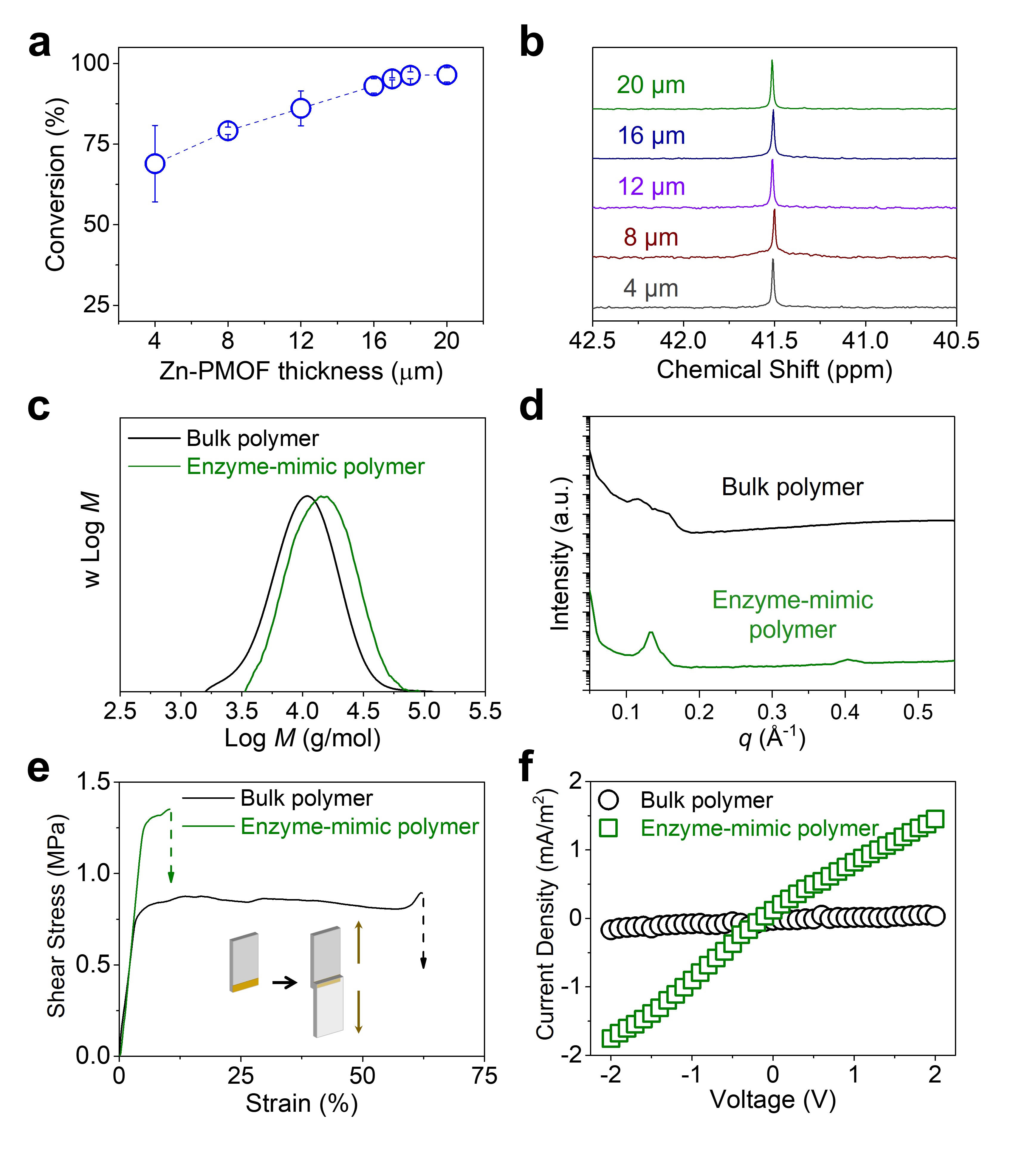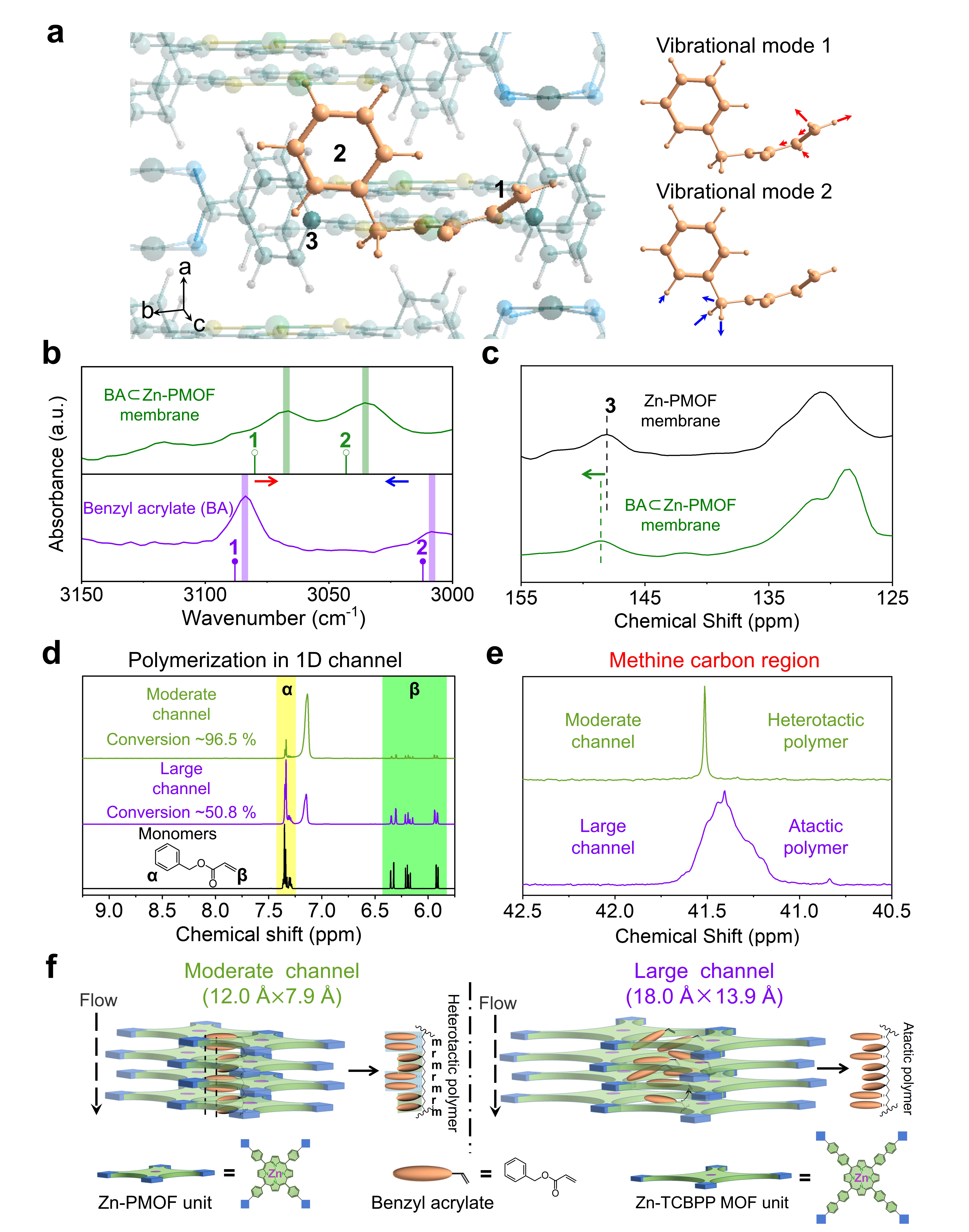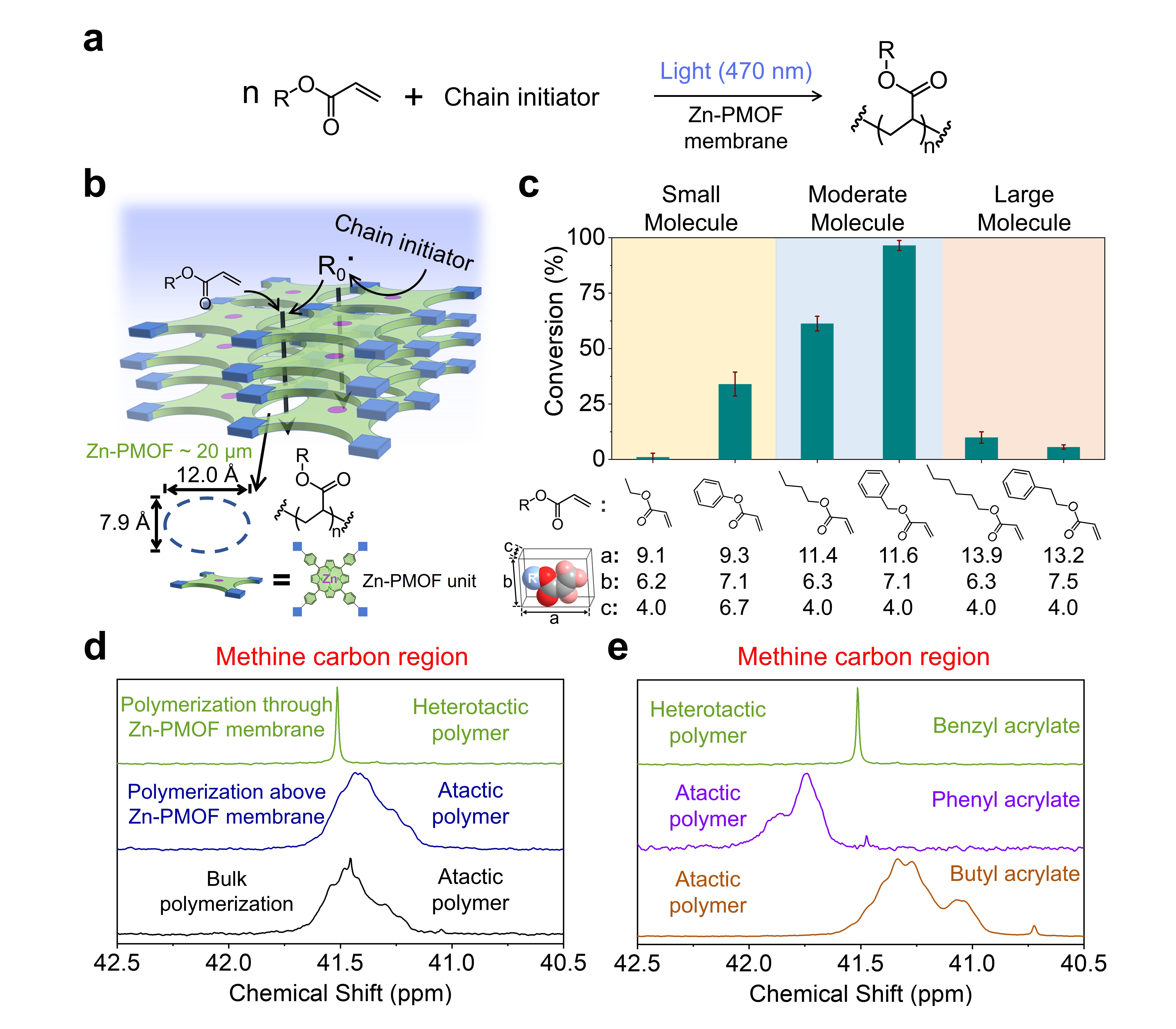 研究人员通过有序堆叠二维Zn-PMOF纳米片,构建了具有一维纳米通道(12.0 × 7.9 Å)的仿生膜催化材料。锌卟啉中心在可见光激发下引发自由基聚合,结合通道尺寸与单体分子的精准匹配,以及通道-单体相互作用,实现了对聚合物链立体构型的精准调控。实验表明,单体在限域通道内的聚合转化率达96.5%,产物构型呈现均一的异规结构(99% mr),显著优于体相反应和现有催化材料的性能。密度泛函理论计算和通道尺寸调控进一步揭示,通道-单体相互作用和尺寸匹配效应协同影响聚合过程。该技术制备出的聚合物展现出显著性能优势:所得聚合物的结晶度、剪切强度及离子电导率较体相产物均显著提升,且通过调节膜厚可进一步调控聚合产物的分子量。这一成果不仅为实现温和条件下极性单体的高立体选择性聚合提供了新策略,还为理解生命体系超低能耗化学合成问题提供新的思路。