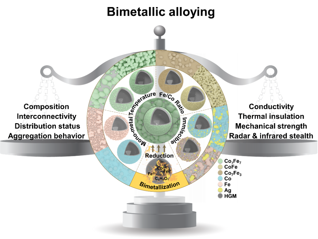 近日,该团队实现新突破。团队聚焦于FeCo-玻璃双壳空心微球,通过精妙的合金化诱导特殊分布控制策略,成功实现了微波吸收与热性能的协同优化。团队以硅酸盐玻璃作为支撑壳,金属作为功能壳,巧妙地利用界面差异使功能单元在玻璃壳层表面的分布状态得到控制。研究发现,合金化如同神奇的 “调控钥匙”,能够显著影响氧化物前驱体的还原温度、Tammann 温度以及过渡壳层的形成,进而有效地调节金属结构单元的迁移和聚集行为,使构建电磁和热网络简单可控。相关成果以Collaborative Optimization of Microwave Absorption and Thermal Properties of FeCo-Glass Dual Shell Hollow Spheres Enabled by Alloying-Induced Special Distribution Control为题发表于Advanced Functional Materials。论文第一作者为中国科学院理化技术研究所博士生李曼,通讯作者为安振国研究员和张敬杰研究员。该研究得到了国家重点研发计划、国家自然科学基金等项目的支持。