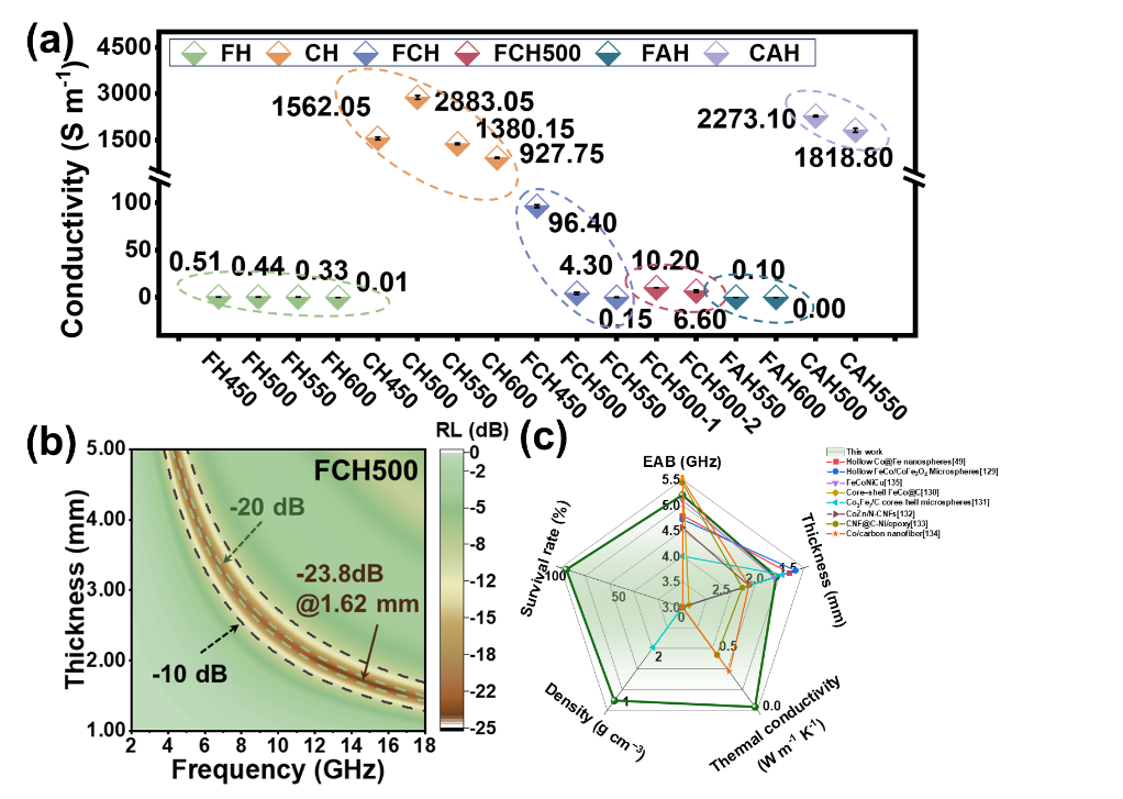 图3:(a)不同金属体系复合微球的电导率;(b)FCH500的电磁波吸收性能图;