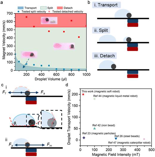 机器人的移动速度和液滴的体积对液滴操控行为的影响 (a)不同移动速度和液滴体积下磁性机器人的液滴操控行为。(b)三种液滴操控模式示意图。(c)液滴操控过程中受力分析示意图。(d)对于50 微升液滴,本项工作与其他方式液滴输送速度的对比。
