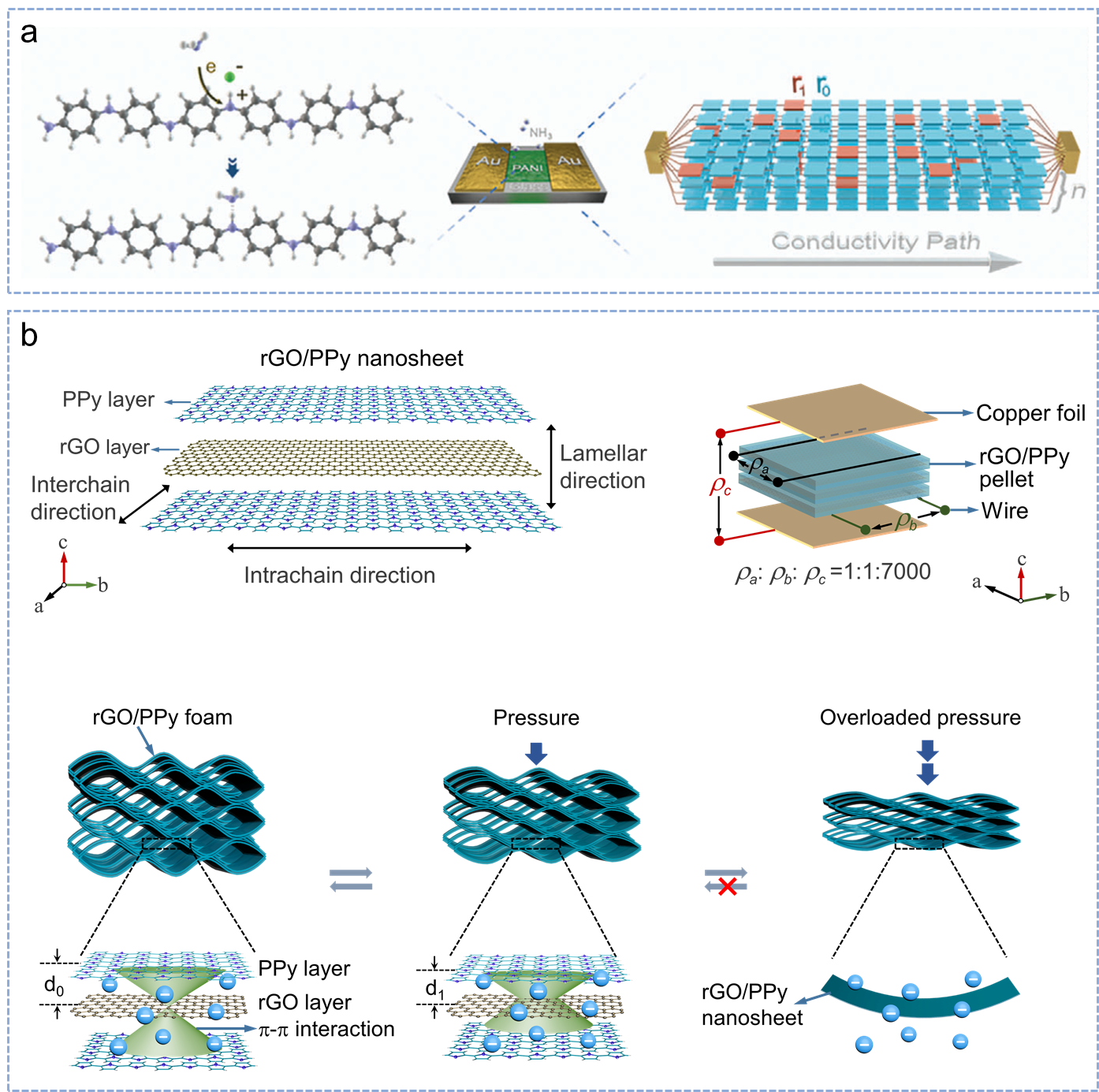 基于上述有序导电高分子可控制备策略,团队在分子尺度上实现了导电高分子材料的精确结构设计、制备、调控和导电机制解析,为其在高性能器件和先进智能材料领域的应用提供了材料基础和理论依据。在传感领域,团队通过提升高分子链有序性,促进载流子高效输运,从而提升传感器的灵敏度、选择性和稳定性(图2a)。在距离/压力传感方面,通过引入半刚性高有序导电高分子,显著提升了材料机械强度与器件灵敏度(图2b)。在热敏传感方面,团队通过原位无溶剂聚合在多类基底上制备出高度有序纳米薄膜。这些薄膜材料均表现出优异的热响应特性,其有序结构显著提升了材料的载流子热激活输运效率,实现了超高的温度分辨率与灵敏度。