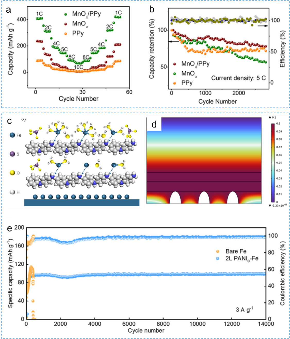 在新能源领域,二维有序导电高分子的引入在提高电子和离子传输效率的同时,可有效缓解充放电过程中电极材料的体积膨胀(图3a和b)。在金属负极方面,采用双层有序二维导电高分子薄膜作为铁负极材料的保护层,可以促进铁离子均匀沉积(图3c和d),显著提升电池循环寿命和倍率性能(图3e)。