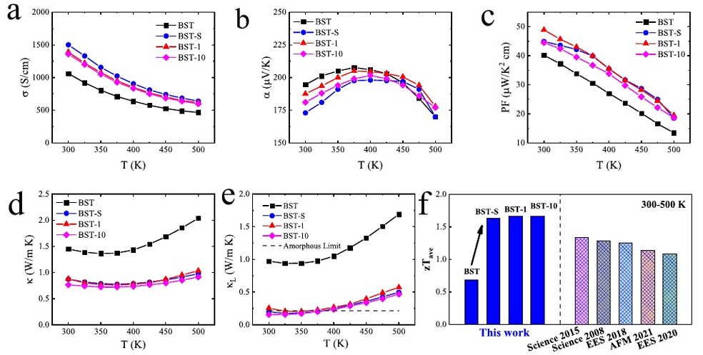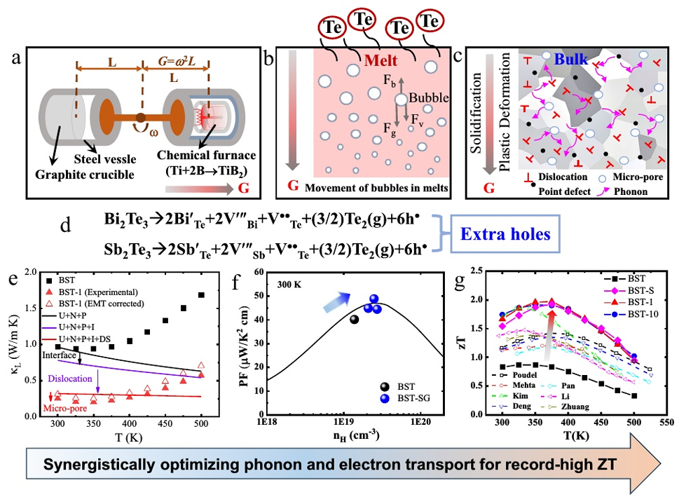 在超重力场的作用下,脆性BiSbTe热电材料经历了不同寻常的塑性变形,并形成了大量微观结构缺陷,这在常规制造工艺中极为罕见。从而实现了微观结构重构,结合载流子浓度优化功率因子,使BiSbTe合金的晶格热导率低至l<0.25 W/m K,热电优值zT>1.91(图1),这是目前报道的最高值。