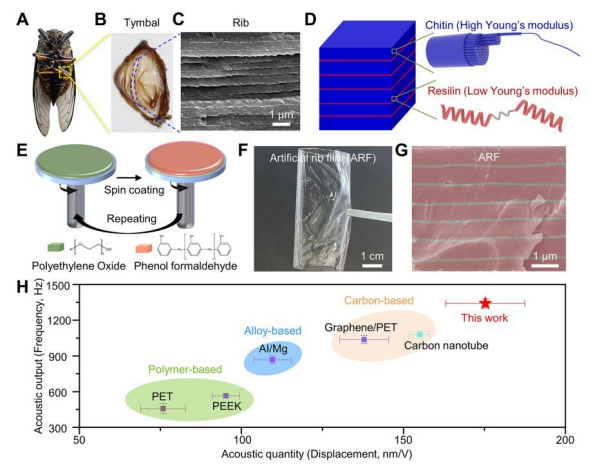 科研团队解析蝉发声器官——蝉肋骨膜的结构与性能关系,并据此仿生制备出可用于声学换能器的高性能仿生薄膜。团队发现,蝉肋骨膜中软弹性蛋白层与硬几丁质层交替排列的结构,是其优异力学性能的关键,即硬质层承担机械负荷,软质层通过大变形能力延缓裂纹扩展。基于这一机理,团队采用层层交替旋涂限域构筑与界面交联策略,制备出具有仿生软硬交替结构的全有机复合薄膜。在限域条件下,聚合物分子链之间的缠结作用增强,使该仿生薄膜同时具备高拉伸强度、韧性和耐疲劳性能。这些特性使其能够兼顾高效声能输出与长期稳定的声传播性能,其基本共振频率和振幅均优于现有商业化薄膜。