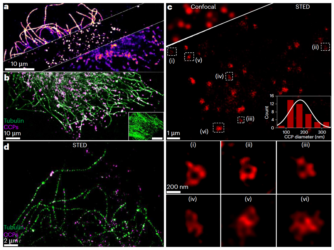 在性能设计与功能优化上,suPdots展现出显著优势:其一,探针选材兼顾实用性与多样性,选用可商业化获取的共轭聚合物链,且荧光光谱覆盖全光谱范围,满足不同场景的成像需求;其二,光物理特性优异,单颗粒亮度约为绿色荧光蛋白(EGFP)的15倍,且不同结构的荧光聚合物链可呈现差异化单颗粒光学行为(如On-Off闪烁、稳定荧光发射),能根据具体成像应用需求灵活选取与调控;其三,表面修饰精准可控,通过对单链聚合物进行特定官能团修饰,可实现suPdots的定量靶向修饰—将其与抗体偶联后,能够对多种亚细胞结构进行高特异性、高密度标记。在实际应用中,suPdots的性能优势进一步凸显:借助受激辐射损耗(STED)超分辨荧光显微成像技术,该探针成功揭示了网格蛋白包被内凹小体的中空环状结构;更重要的是,依托suPdots的高亮度与超小尺寸优势,研究团队使用常规转盘共聚焦荧光显微镜,以50赫兹的时间分辨率和约8纳米的定位精度,清晰解析了单个驱动蛋白在活细胞内的运动步长。这一突破克服了此前研究对复杂且昂贵的MINFLUX超分辨成像仪器的依赖,充分彰显了suPdots在推动纳米尺度单分子水平生物分子研究中的巨大潜力。